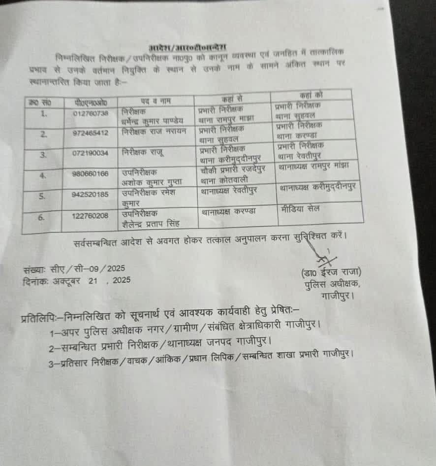 HomeUncategorized गाजीपुर: कई थानाध्यक्षों का स्थानांतरण, राज नारायण करंडा तो राजू दिवाकर को रेवतीपुर थाने की मिली कमान, देखें Uncategorized By बुलंद NEWS डेस्क October 21, 2025 1 0 औड़िहार जंक्शन पर चलाया गया मिशन शक्ति अभियान, महिलाओं व युवतियों को दी कानूनों की जानकारी October 19, 2025 चोरी की बाइक और अवैध असलहे संग अभियुक्त गिरफ्तार October 18, 2025 वीर अब्दुल हमीद सेतु की रेलिंग टूटी: गंगा में गिरने की आशंका October 18, 2025 अपराध निरोधक समिति और एसपीएस स्कूल ने वृद्धाश्रम में बांटी खुशियां October 17, 2025 भाजपा कार्यालय सैदपुर में आयोजित हुआ जी.एस.टी. रिफॉर्म अभियान सम्मेलन October 6, 2025 गाजीपुर। पुलिस अधीक्षक डॉ ईरज राजा ने कानून व्यवस्था को चुस्त दुरुस्त बनाये रखने के लिए कई थानाध्यक्षों का स्थानांतरण किया है। देखें स्थानांतरण लिस्ट Share FacebookTwitterPinterestWhatsApp Previous articleऔड़िहार जंक्शन पर चलाया गया मिशन शक्ति अभियान, महिलाओं व युवतियों को दी कानूनों की जानकारी प्रमुख खबरें औड़िहार जंक्शन पर चलाया गया मिशन शक्ति अभियान, महिलाओं व युवतियों को दी कानूनों की जानकारी चोरी की बाइक और अवैध असलहे संग अभियुक्त गिरफ्तार वीर अब्दुल हमीद सेतु की रेलिंग टूटी: गंगा में गिरने की आशंका Load more ताज़ातरीन ख़बरें बुलंद NEWS डेस्क - October 19, 2025औड़िहार जंक्शन पर चलाया गया मिशन शक्ति अभियान, महिलाओं व युवतियों को दी कानूनों की जानकारी बुलंद NEWS डेस्क - October 18, 2025चोरी की बाइक और अवैध असलहे संग अभियुक्त गिरफ्तार बुलंद NEWS डेस्क - October 18, 2025वीर अब्दुल हमीद सेतु की रेलिंग टूटी: गंगा में गिरने की आशंका Load more
